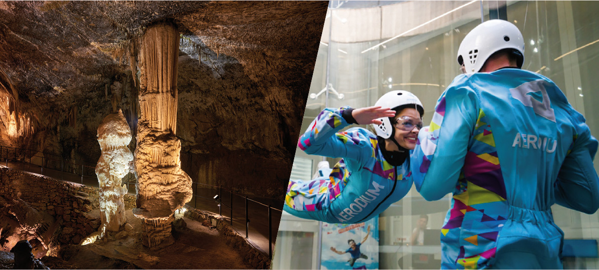 Explore spectacular cave system, meet world’s only living dragon – Human fish, enjoy in a train drive through unexpectedly beautiful underground system and take photos of amazing medieval castle. After you reach surface from deep underneath the ground it’s time to go high above ground and fly in the wind tunnel. Taste the feeling of free fall where you will fly 200 km/h with no wings but only your body! Sounds like a perfect plan? Take a vertical trip from deep down below to high up above the ground!